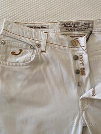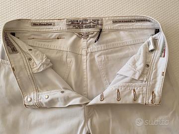 Splendidi, comodi e introvabili Jeans Jacob Cohën si colore bianco, in cotone stretch, tg. 33, modello 688, vestibilità slim, salpa in cavallino bianco, impunture in cintrasto color beige, come nuovi, immacolati, favolosi!