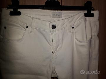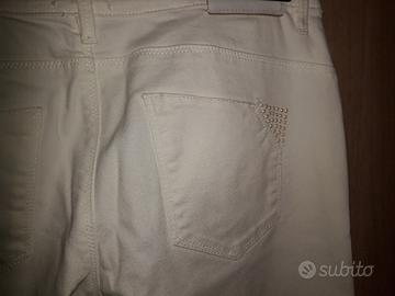 jeans bianco donna leggermente elasticizzato , modello trouser, con passanti, tasche laterali e posteriori, applicazione di perline bianche su una parte di una tasca posteriore , marca Motivi , taglia 44