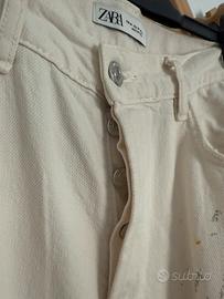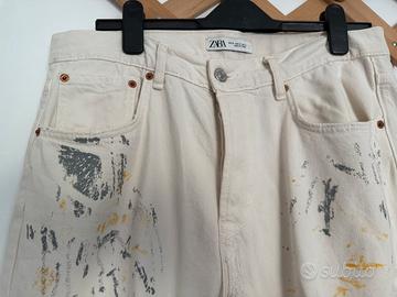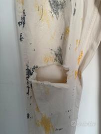 Jeans bianco panna strappato colorato di verde scuro, giallo ocra, grigio e qualche puntino di rosso. Indossato qualche volta, ottimo però per outfit ribelle e provocatorio.