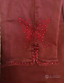 Bottone dorato con fiocco e farfalla in strass sul fondo della gamba sul retro.