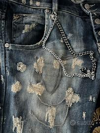 ORIGINALISSIMO JEANS BRAND “ SEXY WOMAN “. INDOSSATO SOLO 1 VOLTA, TG M. APPLICAZIONI DI CATENELLE A CASCATA E STRAPPI. SPACCHETTO ALLA CAVIGLIA. SEMI ELASTICIZZATO. TRATTAMENTO EFFETTO “ USED”
