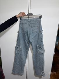 Jeans cargo in denim color azzurro chiaro, stile casual/urban. Modello a vita media con gamba dritta, dotato di tasche cargo laterali e tasche classiche davanti e dietro. Chiusura con bottone e zip.