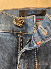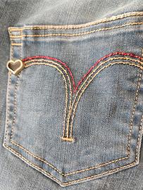 Jeans blu un pò stinto sul davanti. Diritto sopra e svasato dal ginocchio in giù. Chiusura con zip e bottone gioiello a forma di cuore con la scritta del logo. Sulle tasche posteriori un ricamo di cuciture e sulla tasca di sinistra un cuoricino gioiello che richiama il bottone principale.