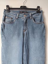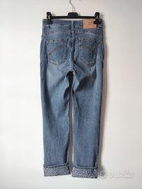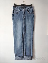 Jeans denim mom fit blu medio CafèNoir. Presenta una vestibilità dritta con un caratteristico risvolto stampato sul fondo.
