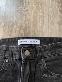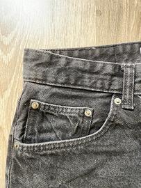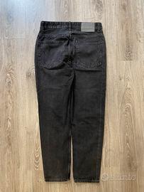 jeans Bershka in denim di colore nero lavato (effetto grigio antracite). Il modello ha una vestibilità mom fit/tapered, che scende morbida sulla gamba e si stringe leggermente alla caviglia. Marca: Bershka Colore: Nero slavato / Grigio scuro Modello: Vita alta, 5 tasche Condizioni: Ottime, denim resistente e senza segni di usura. Stile: Perfetti per un look casual o streetwear anni '90. Taglia: 38