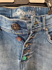 Jeans Desigual azzurro sfumato con decori colorati sulla gamba destra. Allacciatura con vari bottoni colorati. Due taschine davanti e due dietro.