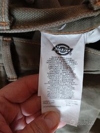 Jeans Dickies larghi, taglia 32, colore verde militare, 5 tasche, applicazione sul davanti con borchie tre, tasca laterale. Leggermente sfilacciati sul fondo come da foto
