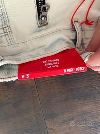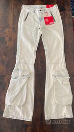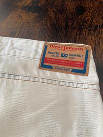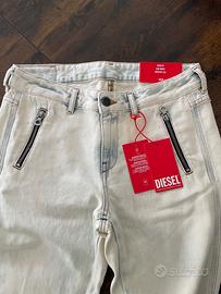 Jeans Diesel bootcut modello D-POKY-OCBCV, originale, dispone anche di certificato di autenticità TAGLIA: W27 (corrisponde ad una 38/40 italiana) VESTIBILITÀ: aderenti sopra e leggermente a zampa sotto, super valorizzanti. COLORE: bianco con sfumature azzurrine molto particolari. MATERIALE: 100% cotone Il prezzo originale è di 450$