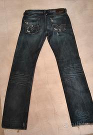 jeans diesel modello Larkee con strappi e toppe interne. ottime condizioni. colore blu scuro e inserto in pelle marrone testa di moro. taglia w31 L 34