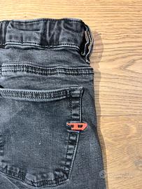 Colore nero leggermente slavato, vestibilità aderente che valorizza la figura. Modello 5 tasche con chiusura a zip e bottone.