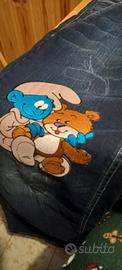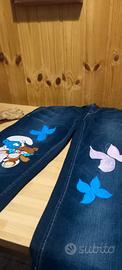 jeans dipinti e ricamati con paillettes a mano con toppa puffi. TG.34 unici e originali no perditempo