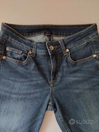 Jeans donna originale Liu-Jo taglia 28 corrispondente alla 42 italiana, larghezza vita 36 cm, fianchi 40 cm, ELASTICIZZATO,, con brillantini inseriti sul retro nel passante centrale e nella tasca, gamba stretta. Bellissimi, pari al nuovo.