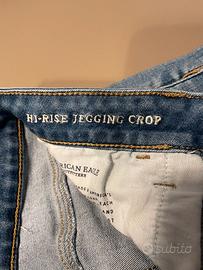 Jeans Donna American Eagle modello hi-rise jegging crop cplore denim ne(x) level stretch x vita normale chiusura con cerniera nascosta con tasche laterali e tasche posteriori. Gamba davanti normale cin piccole frange gamba posteriore a V con piccole frange.