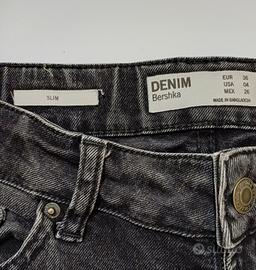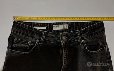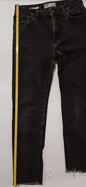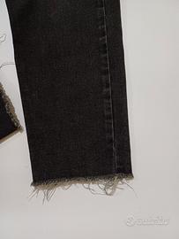 Jeans nero da donna. Vita alta regolabile con elastico. Chiusura con cerniera e bottone. Passanti per cintura in vita. Tessuto elasticizzato. Finale con frange. Veste dritto, modello slim