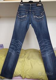 Jeans Fracomina donna, colore blu scuro, alcuni strass nelle tasche dietro. Indossati alcune volte ma in ottimo stato. Il colore delle foto con i dettagli non è corretto. Taglia 38.