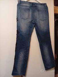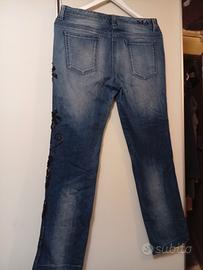 jeans donna vintage brand di prestigio elegante ed estroso in denim con ramage di pietre lustrini e strass solo sulla gamba sinistra