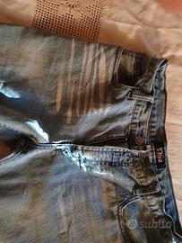 jeans donna con pantalone aferente e fondo kargo con graziose borchie come da foto( in una tasca mancano3)usati e volutanente invecchiati sul davanti come da foto ,marca diva, taglia come da etichetta , (ita44)