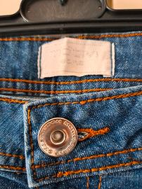 Jeans donna di colore blu, marca Motivi, tessuto elasticizzato, vita bassa, applicazioni di borchiette sulla tasca posteriore, indossato pochissime volte. Tg 42 ( ottima vestibilità per una tg 40).