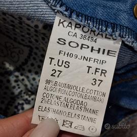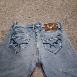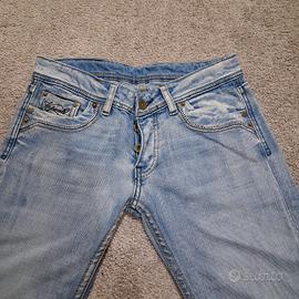 Veste a gamba dritta. Non elasticizzato. Effetto originale di invecchiato e consumato. La taglia sull'etichetta non corisponde. Veste xs. Prendere riferimento alle misure fornite: Larghezza vita: cm 37 Larghezza fianchi: cm 46.5 Altezza cavallo: cm 19.5 Largezza coscia: cm 22 Larghezza caviglia: cm 19.5 Lunghezza: cm 102