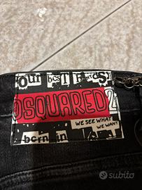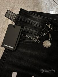 Jeans dsquared icon colorazione nero con scritta bianca, nessuno difetto, nuovo, mai utilizzato, vendo per taglia sbagliata. Nel prezzo è compresa la busta, l'etichette e il cinturino in metallo del jeans .
