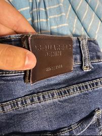 Vendo jeans skinny DSquared2 in denim blu scuro (blu navy), realizzati in cotone elasticizzato per vestibilità aderente e comfort. Taglio affusolato con effetto vissuto, sbiadito e verniciato, dettagli di design come effetti consumati, chiusura a zip nascosta con bottone, cinque tasche classiche, passanti per cintura e logo Dsquared2 ricamato/sul retro. Taglia XL