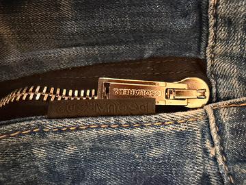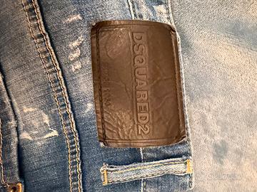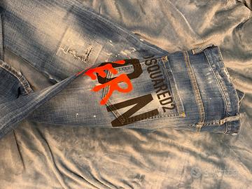Jeans Dsquared2 Skater Jean, taglia 48, Made in Italy. Denim blu chiaro effetto vissuto, scritta “FOREVER” rossa e logo nero “D2”. Patch in pelle marrone, zip e bottoni personalizzati. Fit slim, look street-luxury con strappi e schizzi bianchi. Ottime condizioni.