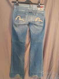 Splendidi jeans stone washed by Evisu a vita bassa modello svasato in cotone tg. 26 pezzo unico vintage in ottime condizioni.