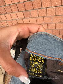 Jeans originali EVISU CU-20, realizzati a mano in Italia, modello raro da collezione con patch artistica EVISU sul retro e ricamo sfrangiato sulle tasche posteriori.