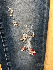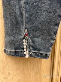 Taglia 24, jeans elasticizzato, effetto vissuto ma non strappato, con applicazioni su tasche, orlo e gamba sx. Circonferenza vita 62 cm, lunghezza vita-cavallo cm 22 cm, lunghezza gamba 83 cm. Vendo per cambio taglia.