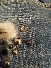 Vendo per inutilizzo, jeans usati Francomina a vita bassa con risvoltini e inserti di borchie tonde nere e argento con zirconi, un po' strappati a gamba larga, taglia 31 (unica imperfezione : perdita di una zircone come in foto) e jeans scuro messo una volta Marina Militare a vita media senza imperfezioni a sigaretta (tg 46)