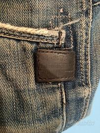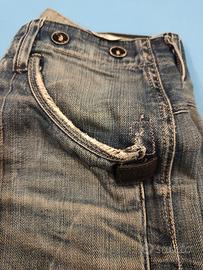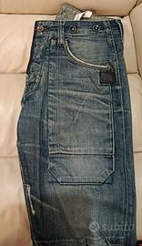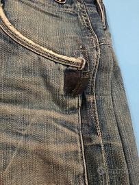 Vendo jeans originali G-Star Raw, modello iconico dal taglio ergonomico Il denim è di ottima qualità, molto resistente. Taglia: M (vestibilità adulto). Stile: Il pantalone ha un look 'vissuto'. Come si vede chiaramente dalle foto, sono presenti segni di usura dovuto al tempo; piccoli strappi vicino alle tasche e orli consumati. Sono dettagli che ne esaltano lo stile vintage, ma ci tengo alla massima trasparenza. Dettagli: Chiusura a bottoni, rinforzi sulle ginocchia e tasche posteriori ampie. Disponibili Ulteriori foto del capo se richieste Buone Condizioni Articolo Non Restituibile