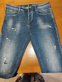Vendo per taglia errata jeans Tg L nuovo ma senza cartellino. 100% cotone, colore blu a varie tonalità strappati ma non vista pelle. Lunghezza gambe cm 80 e h cavallo cm 36, fianchi cm 102 e cintura cm 98