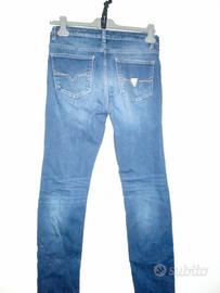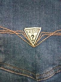 I jeans presentano le classiche cinque tasche: due tasche anteriori (di cui una piccola tasca portamonete) e due tasche posteriori. La chiusura è presumibilmente con bottone e cerniera lampo. Sul retro, sopra la tasca destra, dovrebbe essere presente l'etichetta distintiva di Guess.