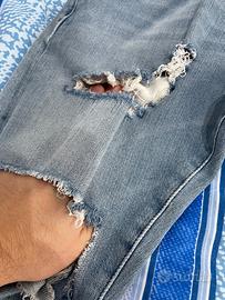 Vendo jeans uomo H&M Tech Stretch, modello Slim/Skinny a vita bassa, colore blu chiaro slavato. Jeans elasticizzati (Tech Stretch), molto comodi e aderenti, con strappi: 👉 ginocchia completamente scoperte, look street/moderno (come da foto). Dettagli: •Marca: H&M •Modello: Tech Stretch Slim / Skinny •Vita: bassa •Taglia: 32/34 •Vita 32 (circa 46 IT) •Lunghezza 34 (gamba lunga) •Colore: blu denim chiaro •Vestibilità : molto aderente •Produzione: Made in Turkey •Condizioni: buone, normali segni d’uso