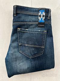 In vendita splendido paio di jeans firmati Iceberg, caratterizzati da un lavaggio blu medio con baffature ed effetti "distressed" (usurati) realizzati con estrema cura.