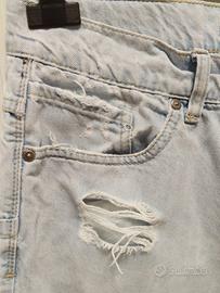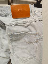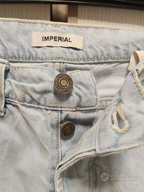 Vendo jeans denim della marca IMPERIAL in lavaggio chiarissimo, quasi bleached. Modello stile "boyfriend" o "straight loose" a vita alta, molto comodo. Presenta numerosi strappi frontali (distressed) e dettagli sfilacciati sulle tasche posteriori. Chiusura con patta a bottoni (no zip). Ottime condizioni generali, stile vintage/streetwear.