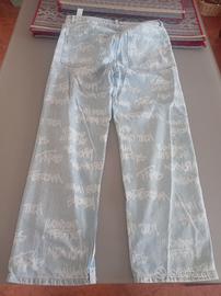 Vendo un paio di jeans a sigaretta in denim azzurro con stampa.