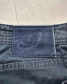 Elegante paio di jeans Jacob Cohën modello J622 (Nick), espressione massima del denim sartoriale fatto a mano in Italia. Questo modello si distingue per la sua esclusiva micro-fantasia geometrica a rilievo (texture a nido d'ape/diamante) che dona al tessuto una profondità cromatica unica e un tocco sofisticato rispetto al classico denim liscio. La linea "Comf" garantisce un bilanciamento ideale tra il taglio moderno e la libertà di movimento.