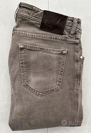 Raffinato pantalone Jacob Cohën modello J622 (Nick), espressione della maestria sartoriale italiana nel mondo del denim. Questo modello si distingue per il taglio slim fit contemporaneo, offrendo un comfort eccezionale grazie alla linea "Comf". Realizzato con pregiato cotone giapponese Kurabo, presenta l'iconica toppa posteriore in cavallino marrone e bottoni logati.