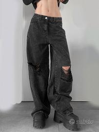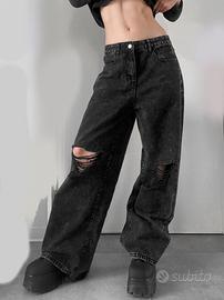 pantaloni larghi , jeans larghi neri con strappi vita medio bassa, taglia S, misure nelle foto. mai usati. neri effetto lavato e strappati, da asos.