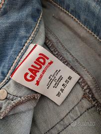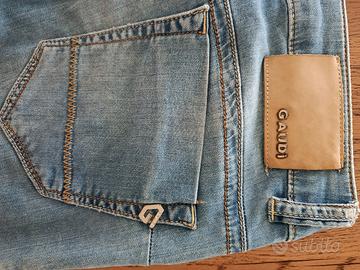 Jeans donna leggins, vita bassa, marchio Gaudi, taglia 29, con due tasche posteriori. Tessuto di cotone elasticizzato, tipo stropicciato, morbido e leggero, colore chiaro, ottima vestibilità.