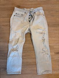 Il jeans e’ usato ma tenuto molto bene. Gli strappi su tutto il pantalone, rendono il jeans accattivante.