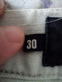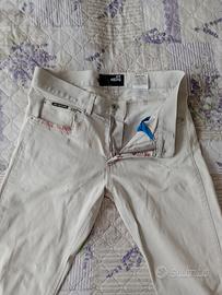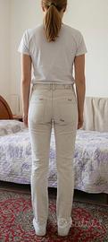 Jeans Love Moschino originali in color crema/panna, taglia 30. Il modello ha un taglio dritto e una vestibilità slim molto versatile, arricchito da caratteristici dettagli di cuciture rosse a contrasto sulle tasche. I pantaloni sono in ottime condizioni, curati nei minimi dettagli e perfetti per un look casual ma ricercato. Tessuto leggermente elasticizzato che garantisce un ottimo comfort una volta indossati.