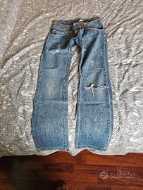jeans modello particolare , 5 tasche profilati in pelle , gamba morbida , vari strappi