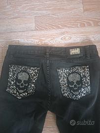Jeans Philipp Plein uomo in denim di alta qualità, con vestibilità moderna. Le tasche posteriori decorate con teschi in brillantini donano un tocco grintoso e luminoso, perfetto per uno stile audace e distintivo.