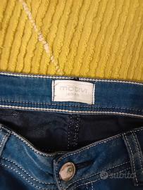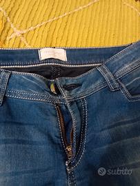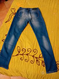 jeans motivi donna, color blu con macchie scolorite, vita bassa ,misure lunghezza 97 vita 74 taglia 44