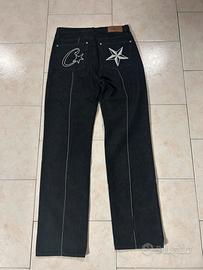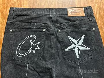 Jeans in denim nero con cuciture bianche a contrasto lungo le gambe. Sul retro presentano ricami bianchi a foma di suelle sulle tasche posteriori.