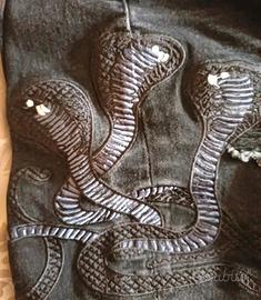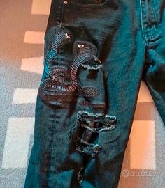 Jeans neri con un design unico. - Dettaglio snake sul lato. - Strappi evidenti su tutta la gamba. - Vestibilità aderente.