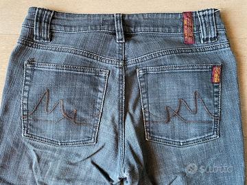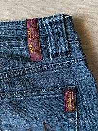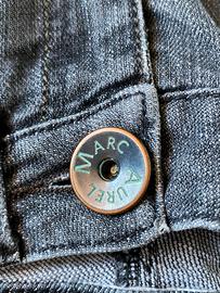 Jeans 5 tasche denim nero elasticizzato Marc Aurel, misura 36. Skinny fit. Finitura accessori brunito. Chiusura con zip + bottone metallo siglato; rivetti siglati. Graffio alla gamba sinistra. Due etichette patch logo bordeaux + gold. Ricamo marrone sulle tasche posteriori. Lunghezza cm. 102; vita cm. 38; gamba cm. 26; fondo gamba cm. 16. NO etichetta di composizione e manutenzione.