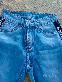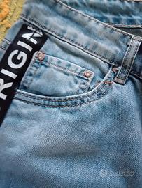 jeans Origins color azzurro, con striscia nera su sui fianchi con scritta Origins, taglia XS lunghezza 90 cm vita a 68 cm , nuovi senza cartellino
